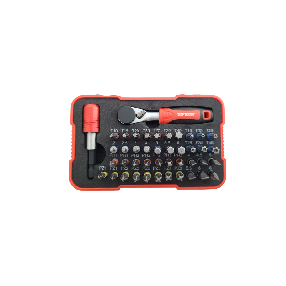 De 1/4'' Bitten Set met bitratel Buitenzeskant, 43-delig, bevat een veelzijdige ratel met 72 tanden voor soepel en nauwkeurig draaien. De set wordt geleverd in een compacte opbergbox en is voorzien van een kleurcodesysteem voor eenvoudig identificeren van elk bitprofiel. Ideaal voor professioneel gebruik en precisiewerk.