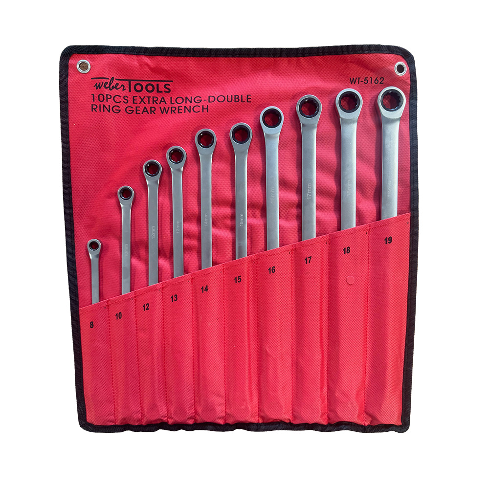 De 10 delige extra lange ringratelsleutelset combineert precisie en kracht in één compact pakket. Het rechte ontwerp zorgt voor maximale krachtoverbrenging, terwijl het fijn getande ringratelmechanisme met 72 tanden en een ratelhoek van slechts 5° efficiënt werken zelfs in krappe ruimtes mogelijk maakt. Alle sleutels hebben een glad, verchroomd oppervlak en worden netjes opgeborgen in een praktisch gereedschapmap. Ideaal voor professioneel gebruik en veeleisende klussen.