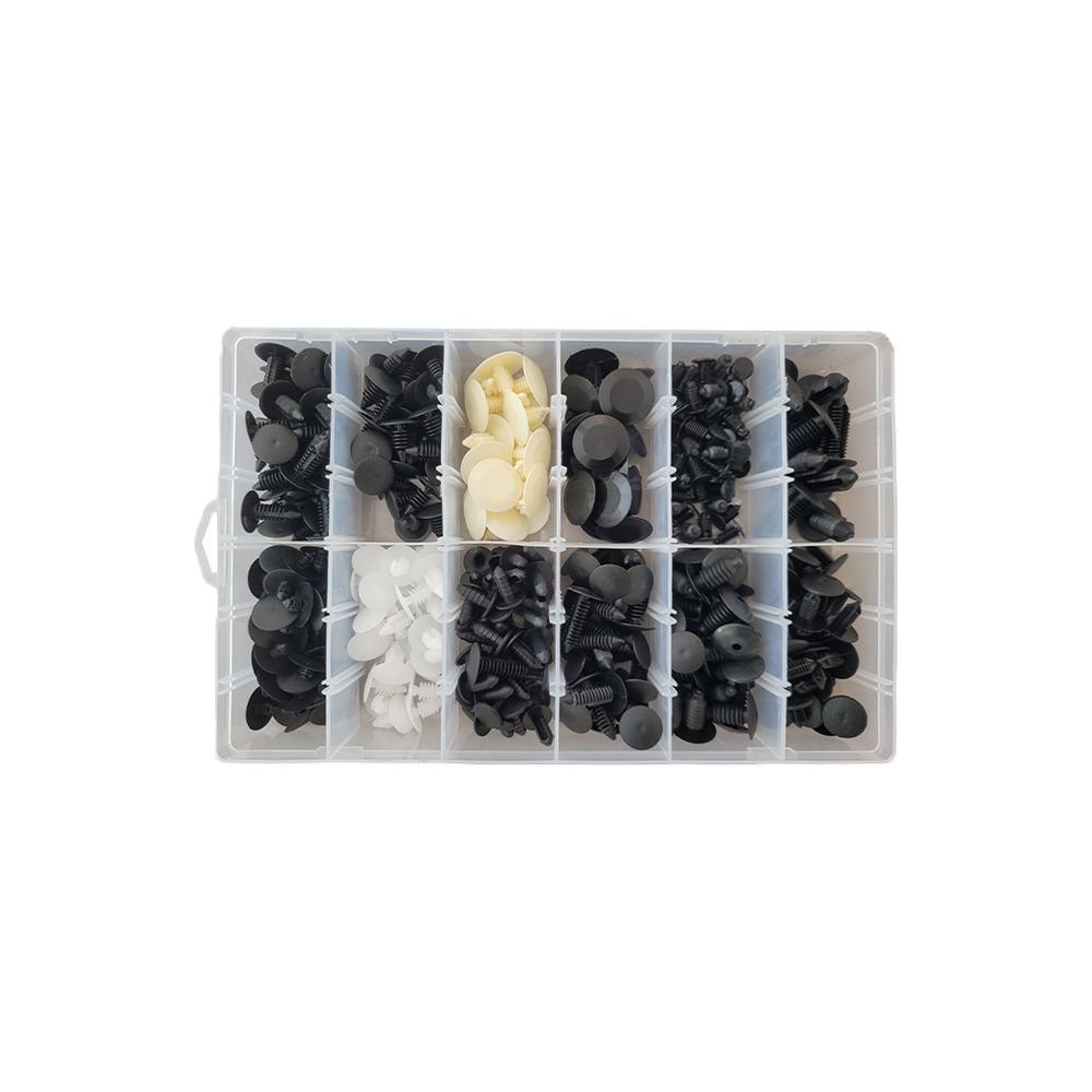 Assortiment van 340 stuks interieur clips voor dashboardpanelen, deurpanelen en bekleding van diverse voertuigfabrikanten zoals Chrysler, Ford, GM, Honda, Renault, Toyota en Volkswagen.