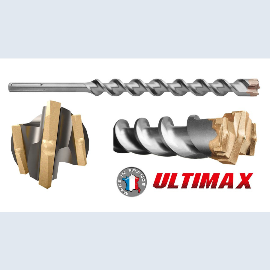 De Ultimax is voorzien van een massieve volhardmetalen kop, wat zorgt voor uitzonderlijke slijtvastheid en probleemloos boren door gewapend beton en wapeningsstaal.