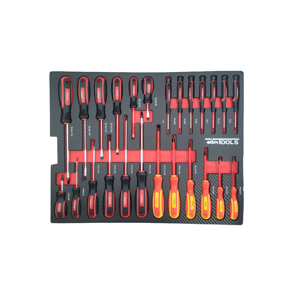 - Sleufschroevendraaiers 3x75mmL - 5x100mmL - 6x38mmL - 6x100mmL - 6x150mmL - 8x150mmL